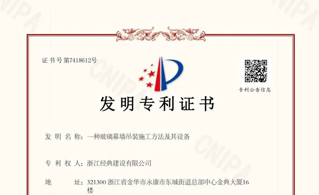 近日,浙江經(jīng)典建設(shè)有限公司的“一種玻璃幕墻吊裝方法及其設(shè)備”獲國家知識產(chǎn)權(quán)局發(fā)明專利授權(quán),標志著公司在技術(shù)創(chuàng)新領(lǐng)域取得了又一重大突破。這不僅是公司今年獲得的第二項發(fā)明專利授權(quán),更是對其技術(shù)實力的有力證明。